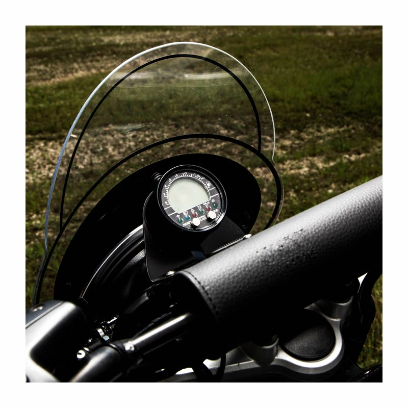 Questo kit consente il montaggio dello strumento digitale in sostituzione al cruscotto originale. Composto da tutto il necessario per il montaggio, compreso la staffa di fissaggio ai nostri telaietti faro e anello per lo strumento. Computer con scocca e ghiera nera Misure: diametro 73 mm – altezza 41 mm. Contagiri e indicatore di velocità fino a 300 Km/h; contachilometri parziali e totali, orario, velocità massima, tempo di percorrenza parziale e totale; Display LCD con due righe digitali e una barra grafica analogica per il contagiri; Display LCD con sfondo a LED blu; Memorizzazione del chilometraggio e della percorrenza totale; Visualizzazione dell’orario anche ad apparecchio spento; Settaggio circonferenza ruota adattabile a tutti i tipi di ruota (1-3999mm di ampiezza); Unità di misura della velocità in miglia o chilometri; Scocca impermeabile; Indicatori di direzione, luci, pressione olio, indicatore neutro e anomalie motore; Indicatore di carburante a barre grafiche. Inclusi nella confezione troverete Sensore di velocità con magnete; Kit di montaggio e staffa tutto in alluminio inossidabile; Cablaggio con attacchi impermeabili in stagno; Istruzioni per il montaggio e manuale.