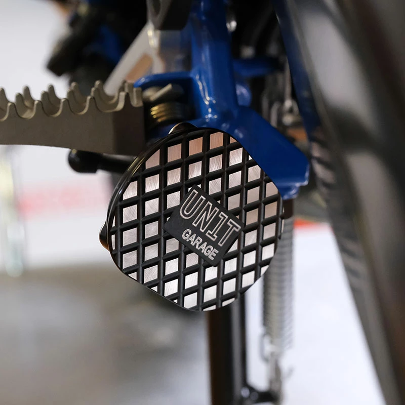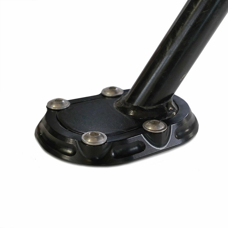 La superfice di appoggio del cavalletto originale e’ piuttosto misera. Su fondo morbido o asfalto bollente questa piastra in Ergal ricavata dal pieno consente un appoggio sicuro. Anodizzata nera antiossidante con incisione e logo sulla dentatura. Si monta in pochi minuti.