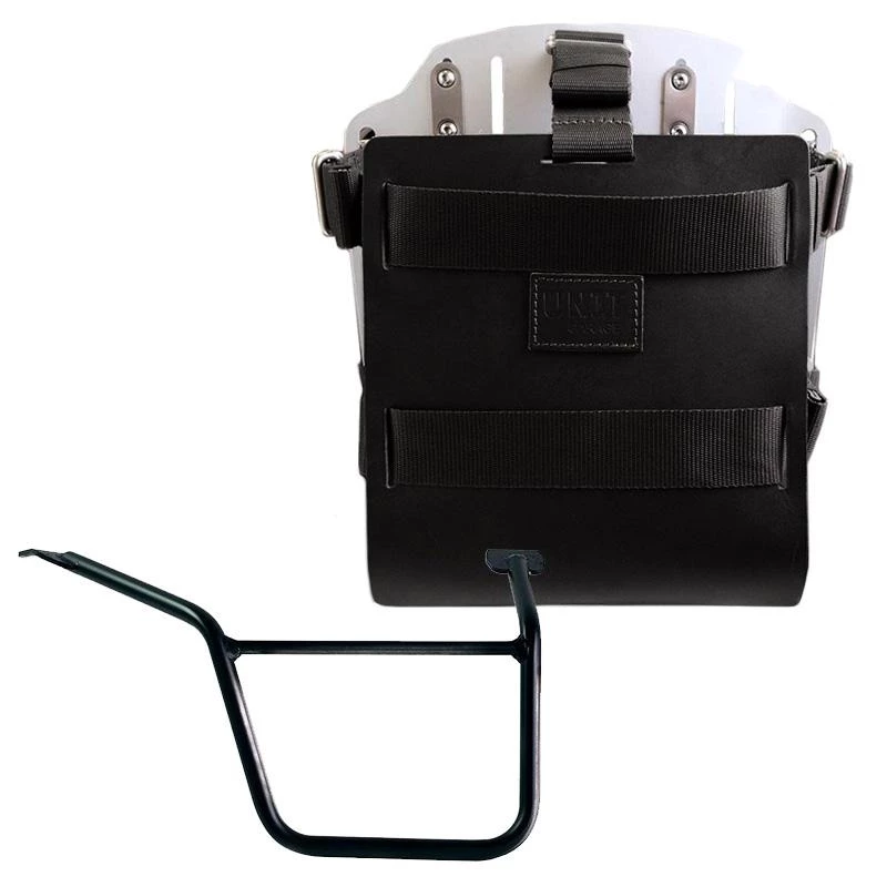 Piastra portaborse in alluminio anodizzato completa di frontale in cuoio regolabile. Si aggancia velocemente ai nostri telai porta borsa con il sistema a sgancio rapido cod.U000 già incluso e montato sul retro della piastra, che è provvisto di serratura per il bloccaggio sul telaio stesso. La piastra crea una superficie di montaggio piatta sul lato della moto, questo consentira’ il trasporto di borse senza aggancio o altri oggetti, tipo sacco a pelo, giacche etc. La patta frontale, curata nei minimi dettagli con finiture in cuoio da 3 mm, puo’ essere regolata tramite i cursori in dotazione e puo’ essere rimossa molto velocemente dalla piastra.