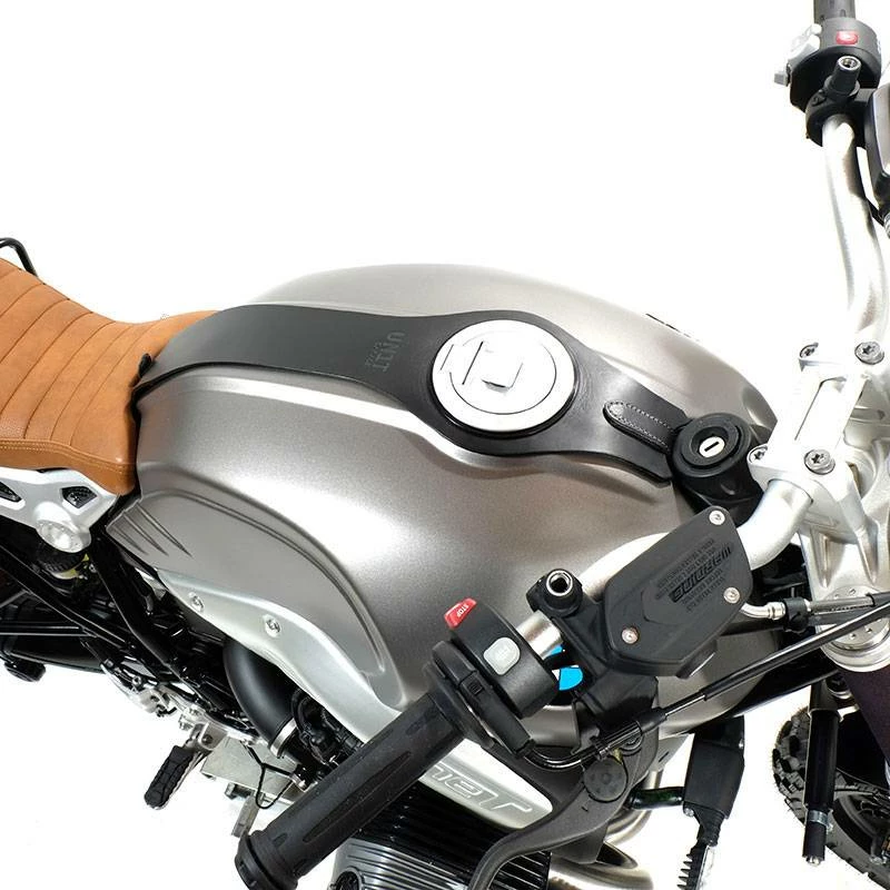Nel kit di montaggio è incluso un distanziale in Alluminio per alzare il tappo serbatoio, così oltre a fissare la fascia in cuoio nella posizione giusta (vedi foto), nessuno sarà in grado di rimuoverla senza le chiavi della moto.