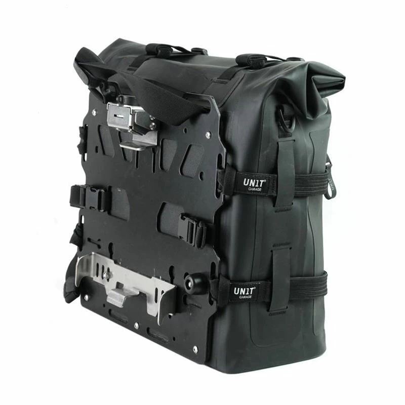 Capienza 35 – 45 L, si monta in pochi secondi ai classici telai in tubo per borse Atlas in alluminio senza l’aggiunta di ulteriori adattatori, è tutto incluso. Può anche essere facilmente regolata per adattarsi alla maggior parte dei telai in tubo da 18 mm di diametro sul mercato, come ad esempio i telai OEM BMW. È dotata di tasche con zip impermeabili sia internamente che esternamente e di fibbie con chiusure magnetiche per una rapida apertura. Per un uso estremo consigliamo di usare gli agganci sulla piastra ed i passanti laterali per il fissaggio di fasce aggiuntive orizzontali come le nostre codice UG008 (vedi foto).