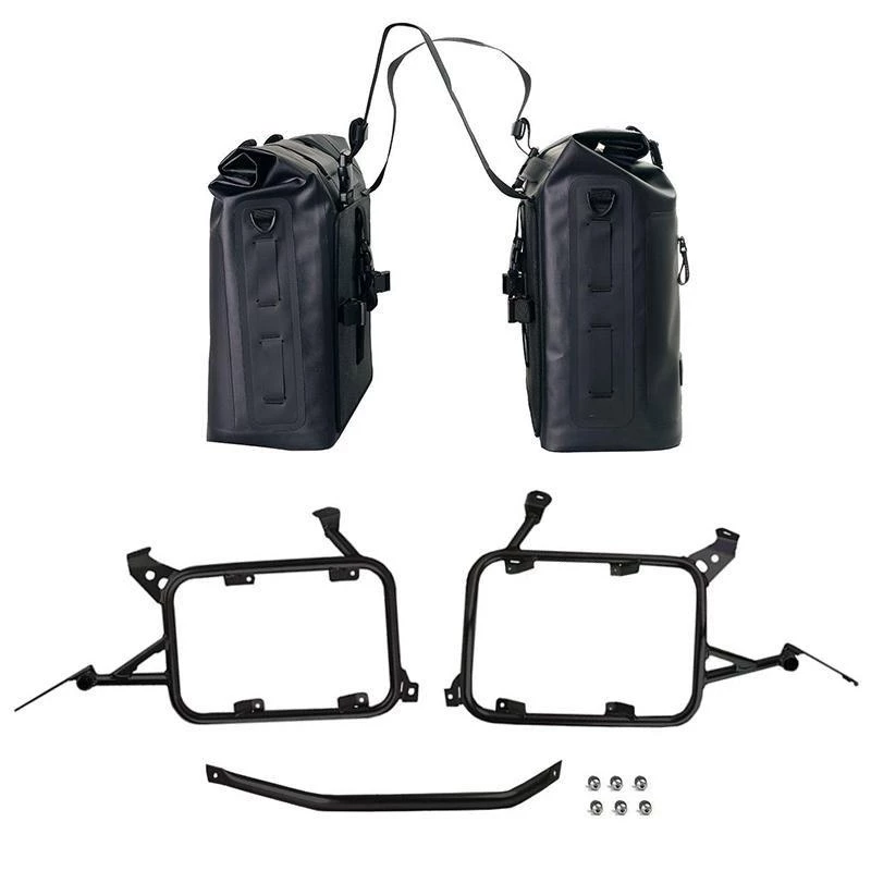 Capienza 35 – 45 L per ogni borsa, si fissano ai classici telai in tubo per borse in allumino di vari modelli senza l’aggiunta di ulteriori adattatori, è tutto incluso. Sono dotate di tasche con zip impermeabili sia internamente che esternamente, di agganci e passanti laterali per il fissaggio di fasce aggiuntive e di fibbie con chiusure magnetiche per una rapida apertura. Se volete collegarle insieme, sono dotate di fasce di aggancio per collegare le due borse facendo il ponte sulla sella o sul telaio.